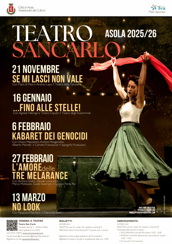 Il Comune di Asola torna a aprire il sipario del Teatro San Carlo di Asola per la terza edizione della stagione teatrale, promossa dall’Assessorato alla Cultura con la direzione artistica di Ippogrifo Produzioni e il sostegno del Gruppo Tea come Main Sponsor.